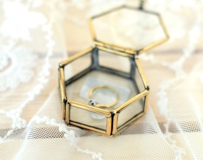 Oferujemy Wam niebanalne szklane pudełko na pierścionek ze szkła i metalu w kształcie heksagonu, utrzymane w stylu vintage . Złote wykończenie z ciemnymi przebarwieniami nadaje mu starego, nieco podniszczonego wyglądu.